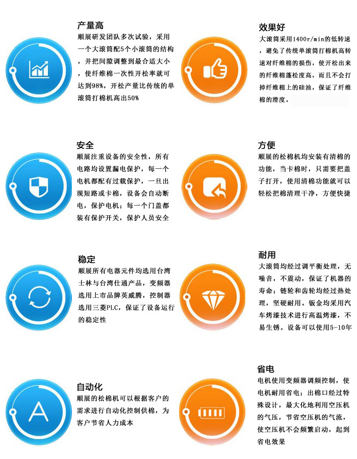 1.PLC系統(tǒng),自動化加棉 2.一次性放100-150公斤原棉 3.可填充7D-15D的長纖或短纖 4.可擺放在不同樓層 5.有清棉功能,清理方便 6.有金屬檢測功能 7.自動化程度高,行業(yè)首創(chuàng)
